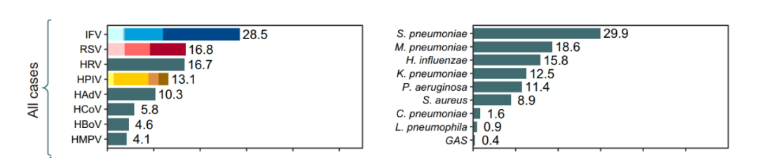 2021年,中国疾病预防控制中心发布的一项历时11年的呼吸道传染病监测数据显示,门急诊流感样病例中常见的病原体为流感病毒(甲型H1N1、甲型H3N2、B型Victoria系、B型Yamagata系、其他亚型)、新冠病毒、呼吸道合胞病毒、腺病毒、人偏肺病毒、鼻病毒及副流感病毒;住院的严重急性呼吸道感染病例中常见的病原体依次为流感病毒、肺炎支原体及腺病毒。[1]