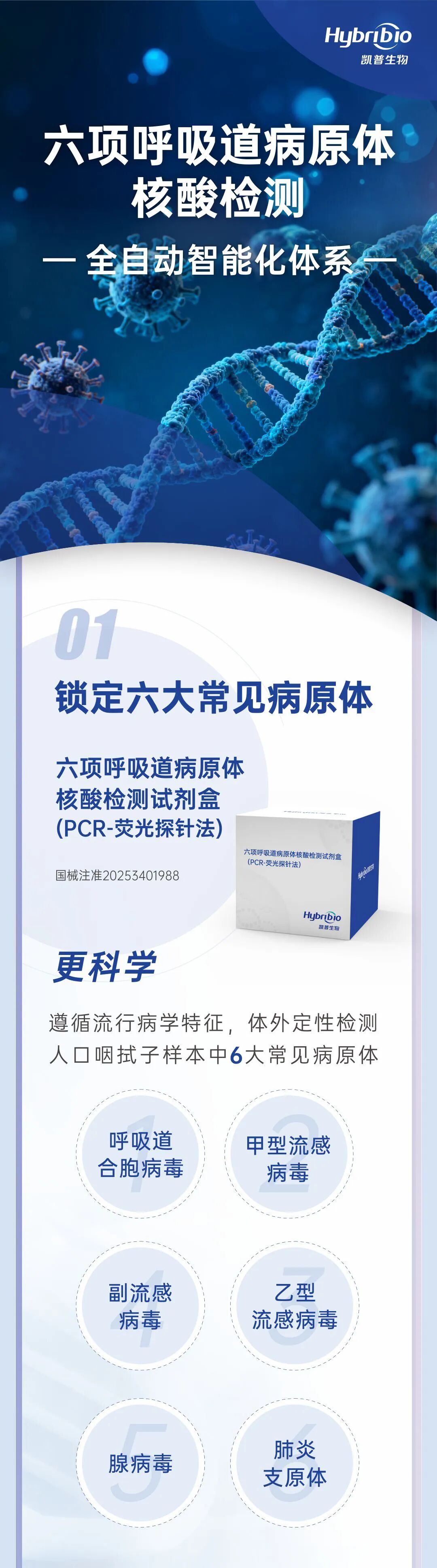 近日,凯普生物(300639)自主研发的六项呼吸道病原体核酸检测试剂盒(PCR-荧光探针法),正式获得国家药品监督管理局(NMPA)颁发医疗器械注册证(注册证号:国械注准20253401988)。该产品用于体外定性检测人口咽拭子样本中的呼吸道合胞病毒、甲型流感病毒、乙型流感病毒、副流感病毒、腺病毒、肺炎支原体,为当前呼吸道感染鉴别诊断提供了高效工具。